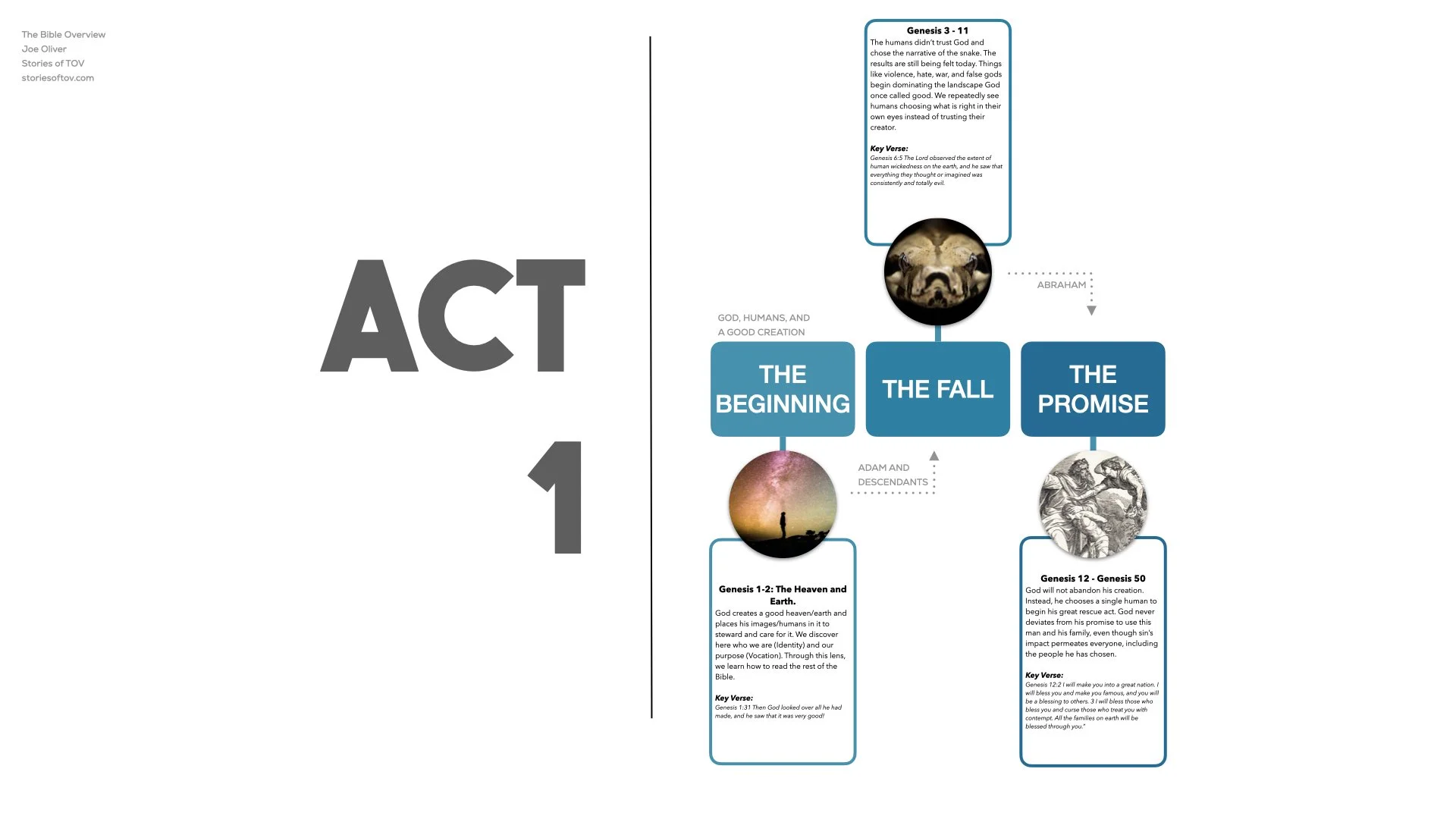 Here’s the way I’ve broken it down: the Bible tells one big story that plays out in three acts. Just like a play or a movie. You’ve got the setup, the conflict, and the resolution. And today, I’m focusing just on Act One. The Setup. Act One includes three movements: The Beginning, The Fall, and The Promise.