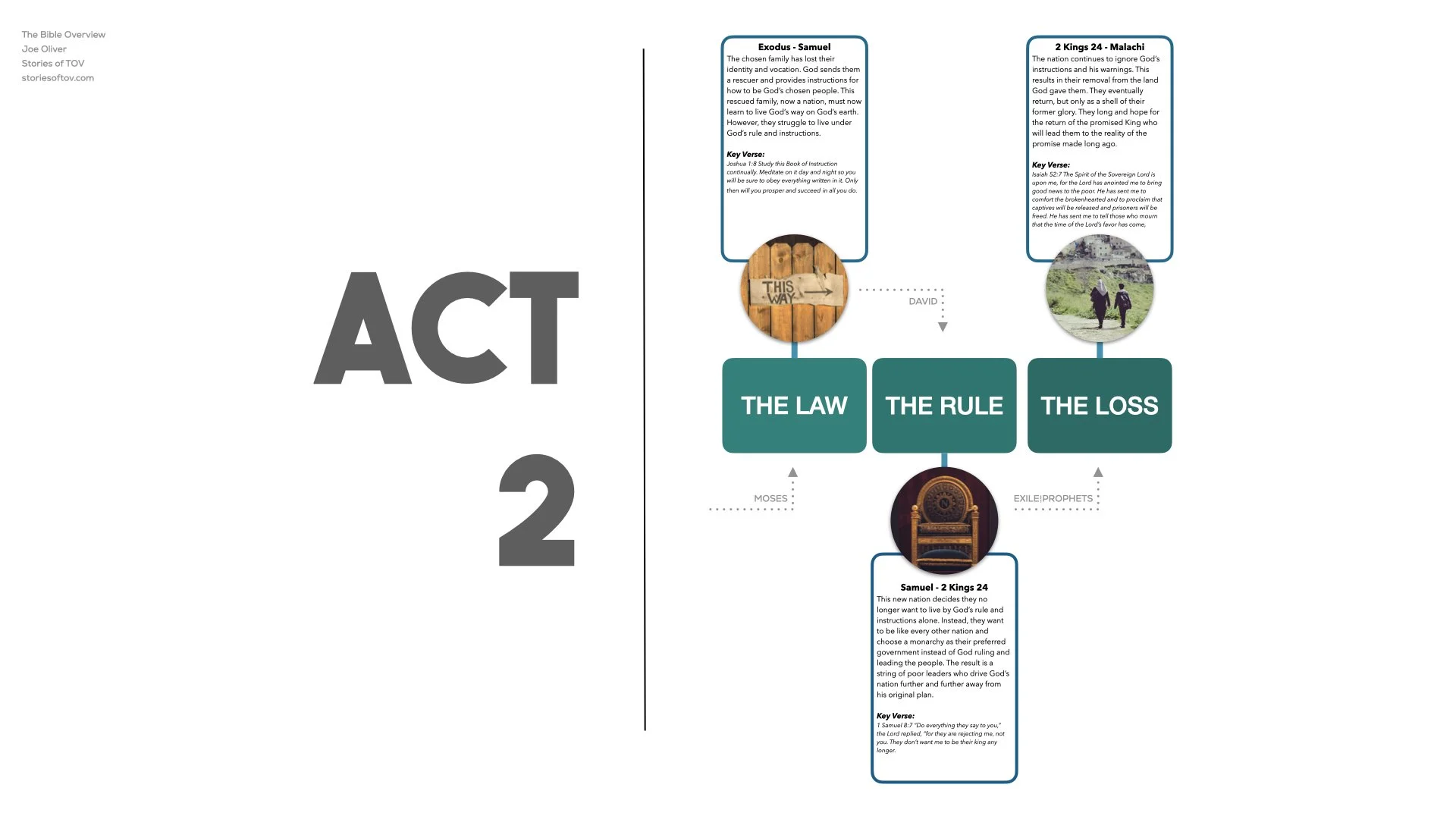 Act Two starts with what I call the Law. That’s the section from Exodus through the early part of Samuel. The people of Israel have been rescued from slavery in Egypt, but they’ve forgotten who they are. They’ve lost their way. And so God gives them instructions—not to crush them, not to control them, but to help them become who they were meant to be. A people set apart. A community that reflects God’s goodness and justice. But what we see instead is a constant pattern of forgetting, rebelling, and circling back again. The laws themselves—some of which feel deeply archaic to modern readers—were rooted in wisdom for that time and place. But the people struggled to live them out. And if you’ve ever struggled to live up to who you know you’re meant to be, you can probably relate.